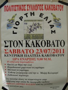 Η εκδήλωση, που είχε σκοπό να ενημερώσει το κοινό για τα οφέλη της βρώσης ελαιολάδου και τον προϊόντων του, έλαβε χώρα το Σάββατο 23 Ιουλίου στον τόπο καταγωγής μου, τον Κακόβατο Ν.Ηλείας.